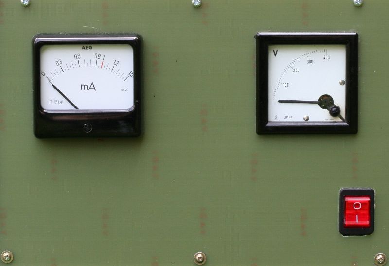 Bild 1: Frontplatte des NT. Links das Instrument für Anodenstrom und rechts für die Anodenspannung.