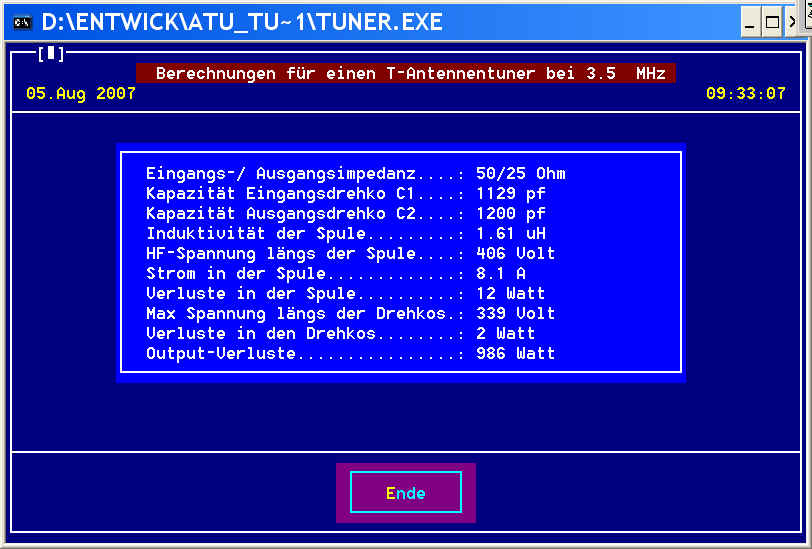Bild 2: Berechnungsbeispiel T-Tuner für 3.5 MHz