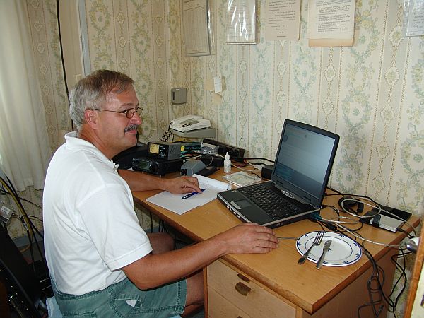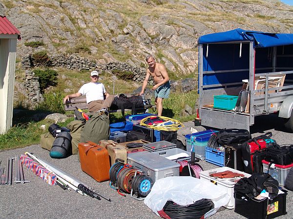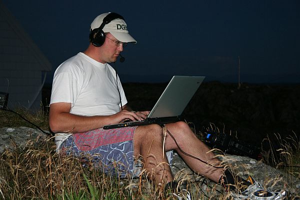 Nachdem alles auf der Insel verstaut war, begann sofort der Antennenbau. Wir errichteten einen Langdraht (mit Smarttuner) vom Haus zum Leuchtturm (36 Meter Höhe), eine Deltaloop (mit Smarttuner) zwischen Haus, Leuchturm und einem Felsen, eine"Force 12 Sigma 40 XK" für 20m, eine "Inverted-V" (40m) an einem Fahnenmast, Langyagi mit Rotor auf dem alten Radarmast, 2m-70cm Vertikal an einem weiteren alten Mast und eine Vertikal aus einem GFK-Schiebemast (mit Yaesu FC-40). Als TRX kamen 2 FT-987, ein IC-703 mit Endstufe und ein IC-706 zum Einsatz. Gefunkt wurde in CW, SSB, PSK31 und RTTY. Die Stationen waren "rund um die Uhr" besetzt. Leider störte ein starkes pulsierendes Signal das 20m Band teilweise erheblich.