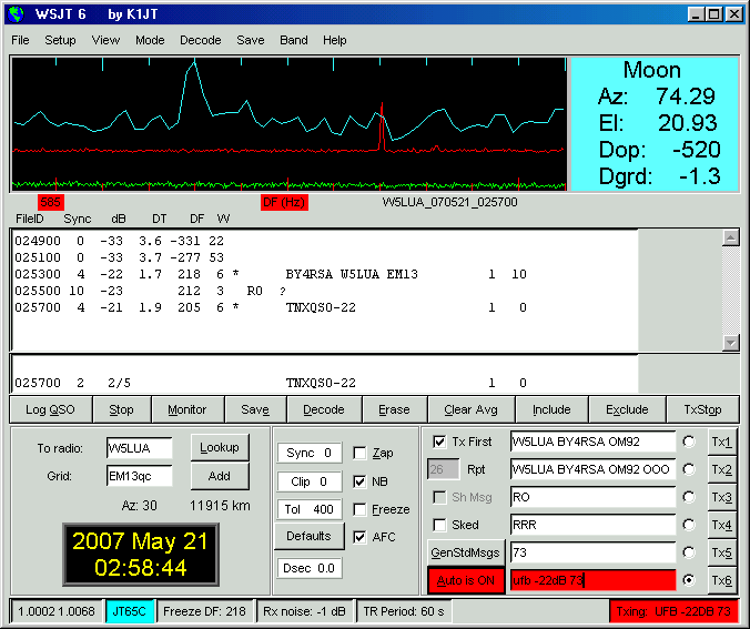 Rig: IC-706mkIIg Transverter: BJ-250 (made by DJ9YW), ca. 96W Antenne: 1,8m Spiegel, 24dBi Gewinn Mode: CW, JT65C (ich TX first) Frequenz: 1296,090 MHz Grid: OM92fa