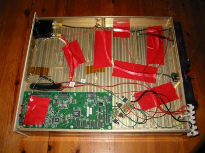 The first RF board (channel selection? modulation?) has been removed, but power distribution and driver board remain used.