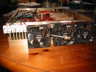 Added homebrew I/O connector as well as three fans. We are dissipating +/- 500W of heat here. I dont like the SMA semi-rigid output line, but did not have space left at the back.