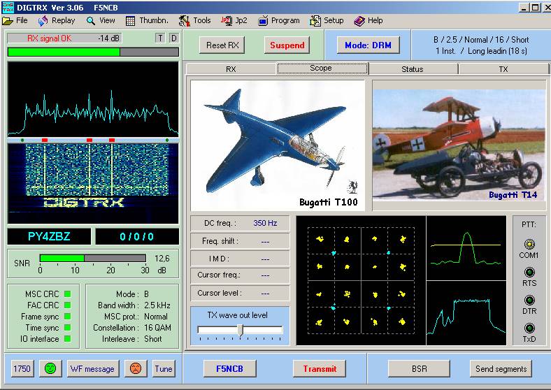 Observe que o DIGTRX mostra duas constelações: em azul a constelação do sinal FAC (informações sobre o sinal DRM), que é sempre em 4QAM, e em amarelo, a constelação do sinal MSC (informação ou dado principal do sinal DRM), que na imagem acima está em 16QAM.