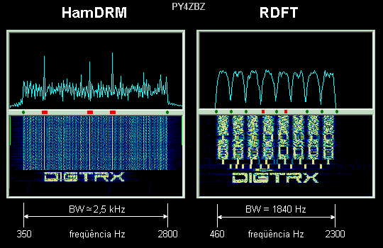 A figura seguinte mostra o espectro e o espectrograma de um sinal HamDRM com BW=2,5 kHz, comparado ao modo RDFT. As 51 portadoras estão tão próximas que não conseguem ser mostradas individualmente no espectro. Apenas se destacam 3 pilotos, que são portadoras com nível maior usadas para facilitar o sincronismo do demodulador e que também podem ser usados como referencia para a sintonia do receptor (marcas vermelhas na escala de freqüência) :