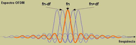 A figura seguinte mostra o espectro (domínio da freqüência) de apenas cinco portadoras OFDM, sendo em laranja uma portadora qualquer fn , e mais quatro portadoras adjacentes (2 acima e 2 abaixo) em azul, e apos terem sido recortadas pela janela de integração do receptor com duração tu. Observe que o máximo de energia de qualquer portadora cai exatamente nos nulos das outras, a chamada ortogonalidade. Observe também que o espectro de uma portadora modulada como no exemplo acima, tem a forma da função senx / x (curva laranja) com nulos a intervalos eqüidistantes e iguais a df, acima e abaixo da freqüência nominal da portadora: