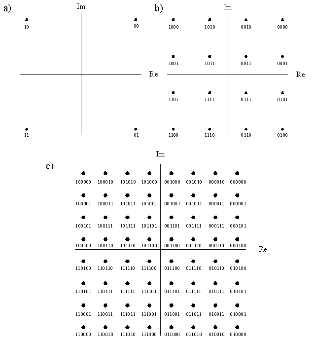 A figura seguinte mostra exemplos de constelações QAM (o eixo I é também chamado Real e o eixo Q Imaginário.  a= 4QAM, b=16QAM e c=64QAM):
