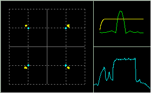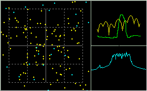 A figura seguinte mostra as três telas gráficas da tela "scope" do DIGTRX. A maior corresponde a constelação QAM, que no caso é um exemplo de 64QAM, e para condições ideais :