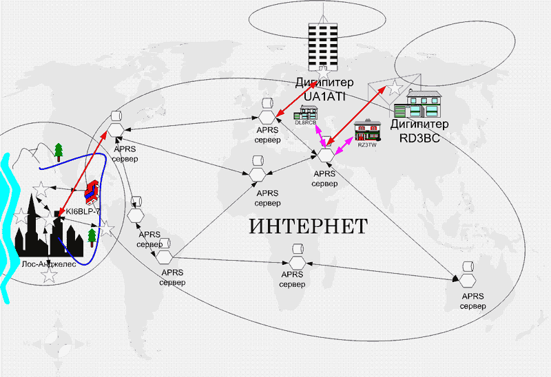 APRS пакеты передаваемые оборудованием Владимира, KI6BLP, размещённого в джипе принимаются сетью дигипитеров (N6EX-1, N6EX-2, N6EX-4, N6EX-5) и ретранслируются в узел APRS сети Лос-Анджелеса N6EX-3 у которого есть шлюз (IGate) в ИНТЕРНЕТ. Через APRS сервера ИНТЕРНЕТА , отфильтрованная фильтром , установленным при регистрации в нём, информация поступает на ИНТЕРНЕТ порты конечных пользователей или дигипитеров.