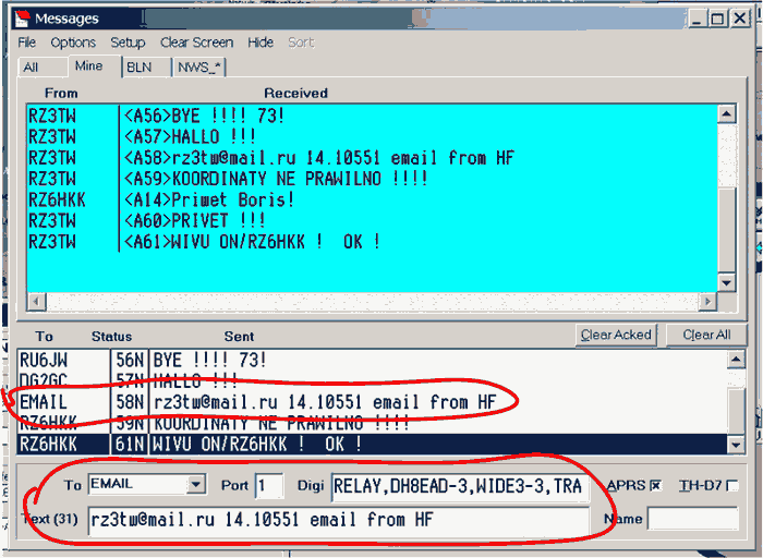 Но, возможность появилась неожиданно. Во время мониторинга частоты 14.10551 в связи с проведением эксперимента по использованию APRS на КВ, на этой частоте был обнаружен сервер DH8AED-3. В ходе эксперимента возникла мысль – А вдруг сервер может электронную почту отправлять, т.к. в его характеристиках указывалась работа по TCP/IP. Набрав в соответствии с инструкцией, без особой надежды, письмо для самого себя.