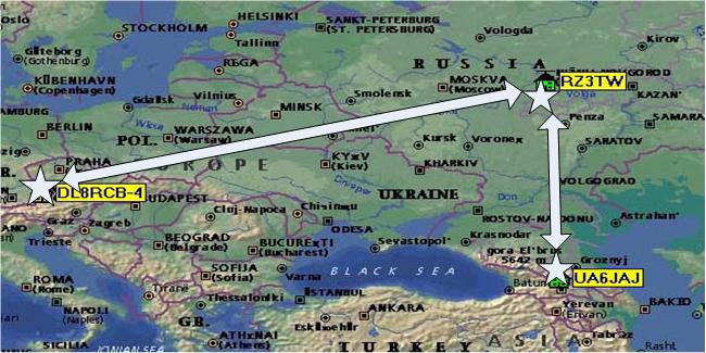 Начали с использования моего комплекса в качестве дигипатера. Оба других комплекса находились в режиме конечных станций. Первые правильно принятые посылки от них были ретранслированы моим комплексом и у меня и у UA6JAJ и DL8RCB на картах появились значки наших станций.
