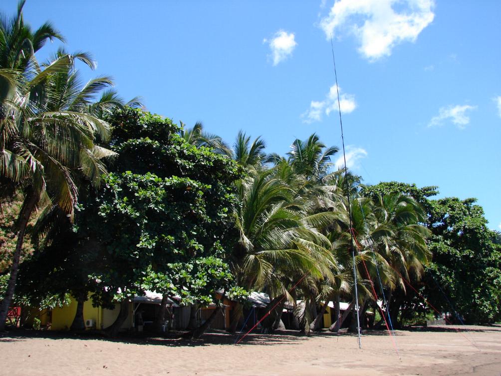 For two nights from April 7th to 9th I was changing my QTH to the beach of Hotel Trévani. A vertical antenna with a total hight of 16m (52ft) was built up soon, radials buried in the beach and the antenna connected with a CG-3000 tuner. Scope was to make contacts in the night hours at least with Europe on 40m and 80m - unfortunately this did not work out. The frustration was compensated by a lot of QSOs on 20m, mainly JAs and Ks.