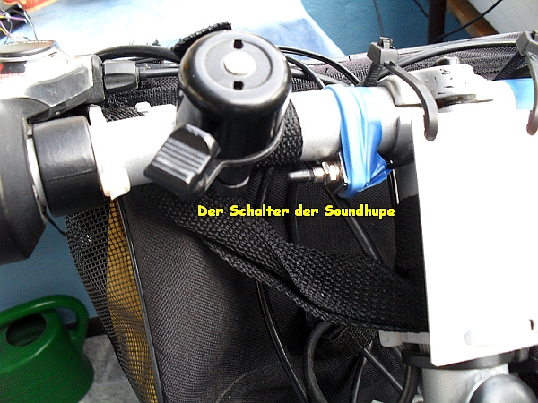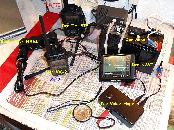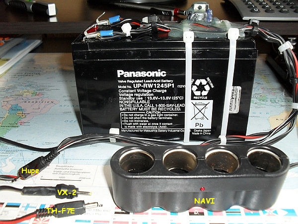 Der fertige Akku von vorn mit allen Versorgungskabeln für TH-F7E, VX-2, NAVI und Sound-Hupe
