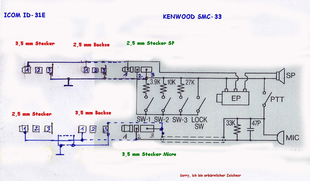 Der Schaltplan der Kupplung des SMC-33 auf das HFG ID-31E Bitte darauf achten, dass man die Masse am 2,5mm Klinkenstecker zum ID-31E nicht die Masse anlötet, sonst geht der ID-31E sofort auf Sendung, wenn man den Stecker in die Buchse steckt. Die Masse für die PTT holt sich die Mikrobuchse über die LS Buchse
