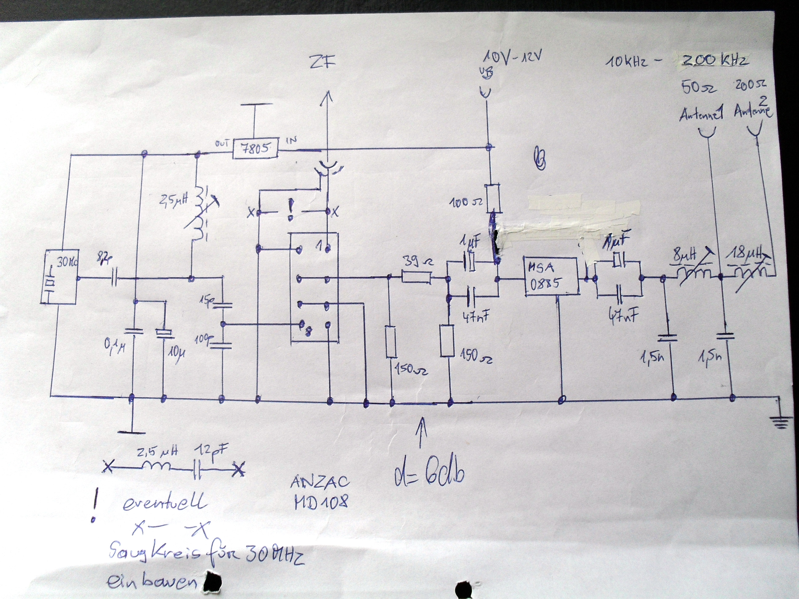 Der Längstwellen-Converter ist eine Eigenentwicklung in Zusammenarbeit mit DC7BW. Bestehend aus einem Quarzoszillator mit einer Frequenz von 30MHZ, einem Ringmischer der Firma ANZAC MD-108 sowie ein Breitbandverstärker der Firma HP Typ MSA-0885.