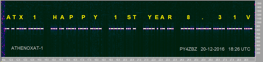 Em 20-12-2016, com um ano no espaço, recebemos a seguinte mensagem em CW do ATHENOXAT-1: