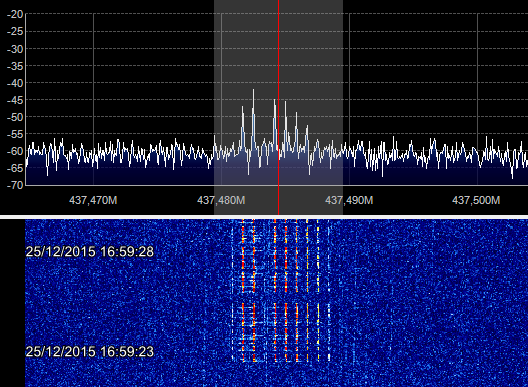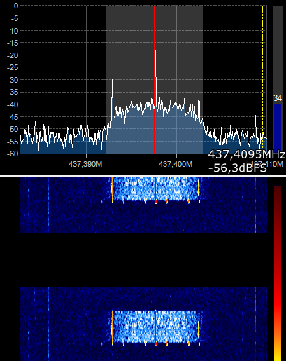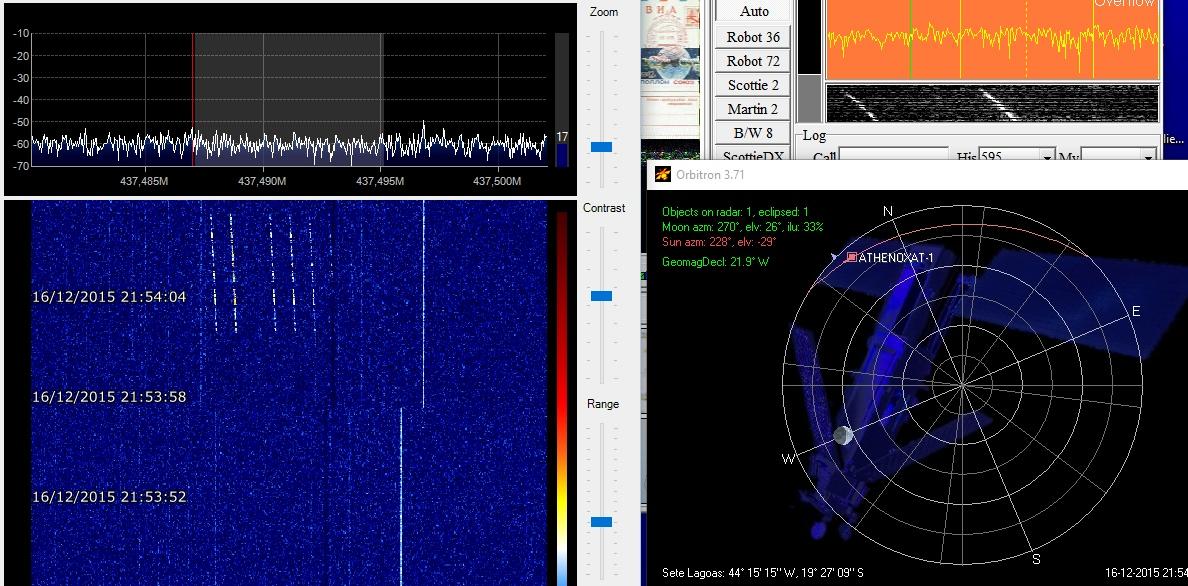 Em 16-12-2015, dia do lançamento, a primeira passagem com visibilidade para mim foi as 21:52 local (23:52 UTC) com apenas 9 graus de elevação máxima, na orbita #7. A figura seguinte mostra a recepção com RTL-SDR e Yagi OWA de 6 elementos: