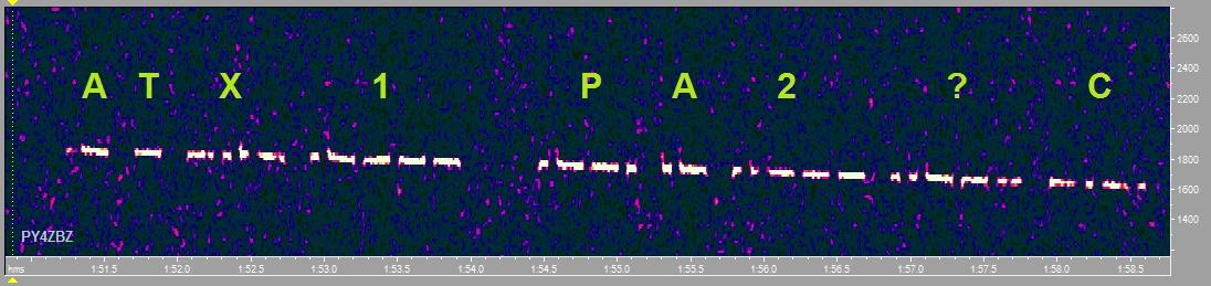 O sinal CW é modulado em FM com tom de 840 Hz, porém com modulação residual em AM pelo mesmo tom, o que torna as raias do espectro assimétricas. Além disso, é modulado em ASK pelo sinal CW:
