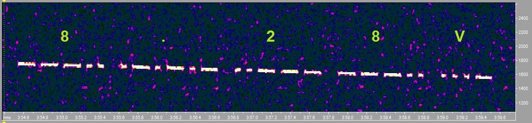 O sinal CW aparece em pelo menos 6 freqüências diferentes, sendo o mais forte o segundo em ordem crescente de freqüência. É porque é modulado em FM com um tom de 840 Hz.