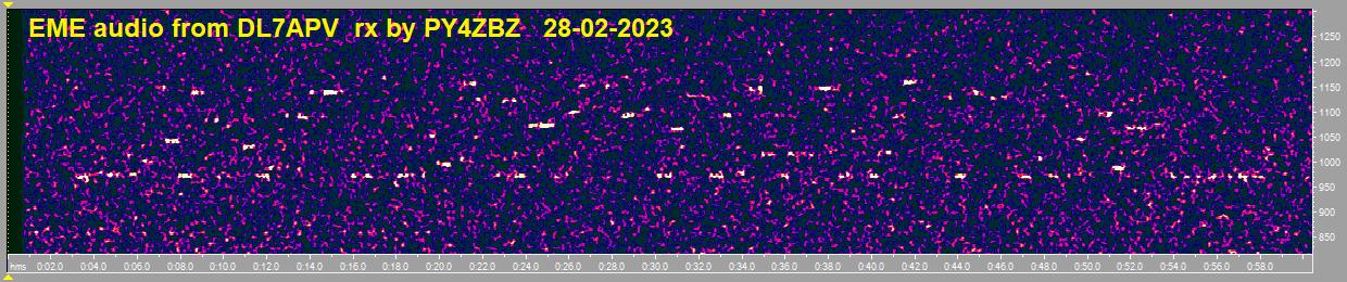 É possível verificar o atraso do sinal em 2,9 segundos, pois a distancia ida e volta para a lua é da ordem de 760.000 km, o que leva 2,53 segundos. A relação sinal/ruído de -11 dB é muito boa, pois a recepção foi feita com uma yagi de apenas 6 elementos.
