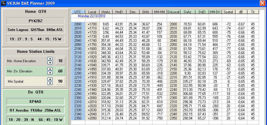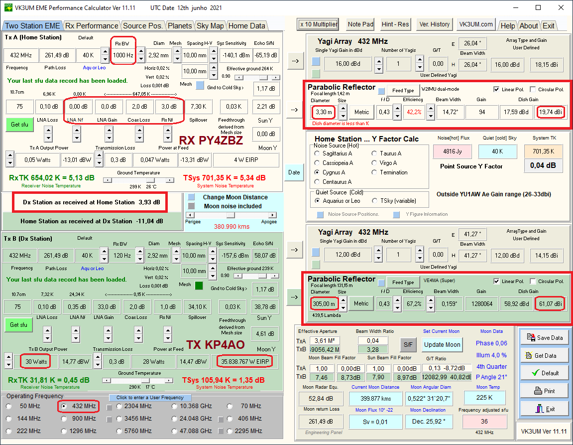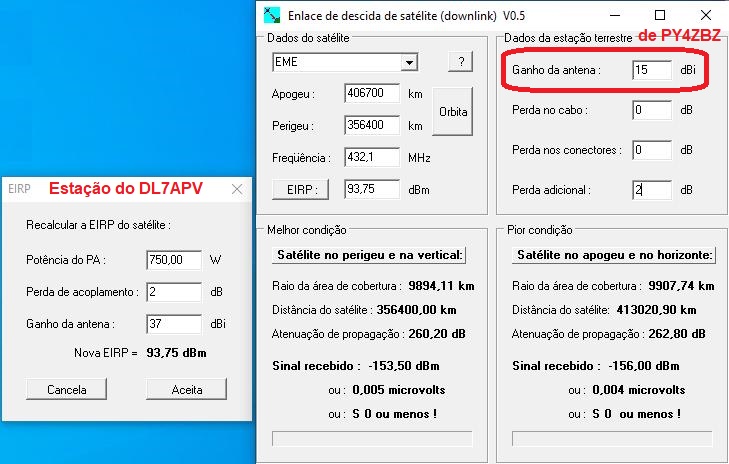Abaixo, meu calculo básico do enlace EME DL7APV-PY4ZBZ. (download aqui)
