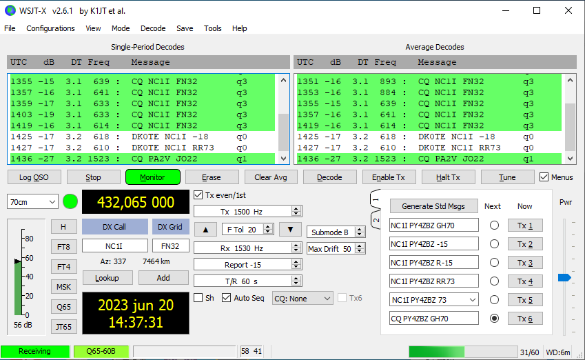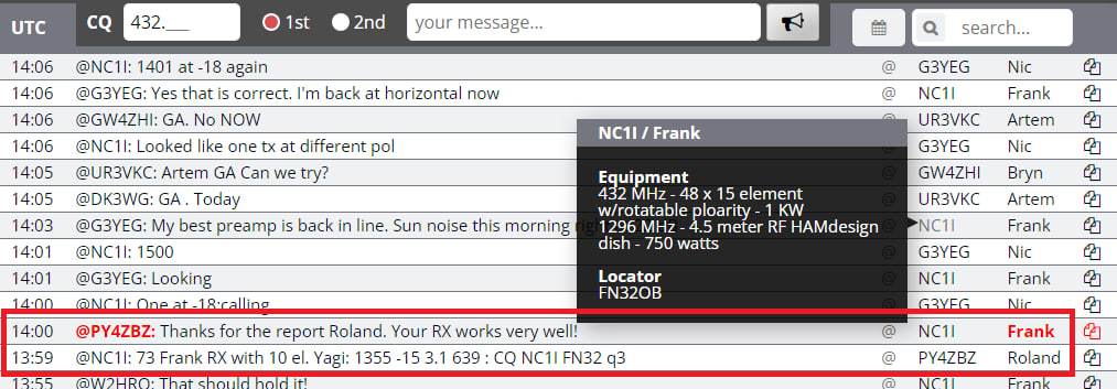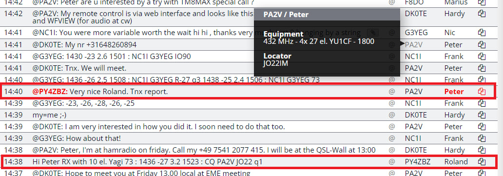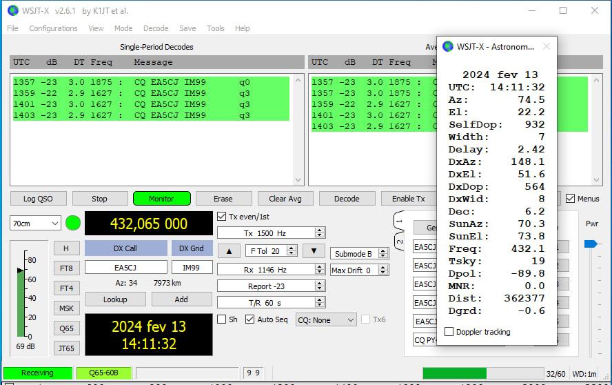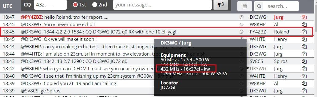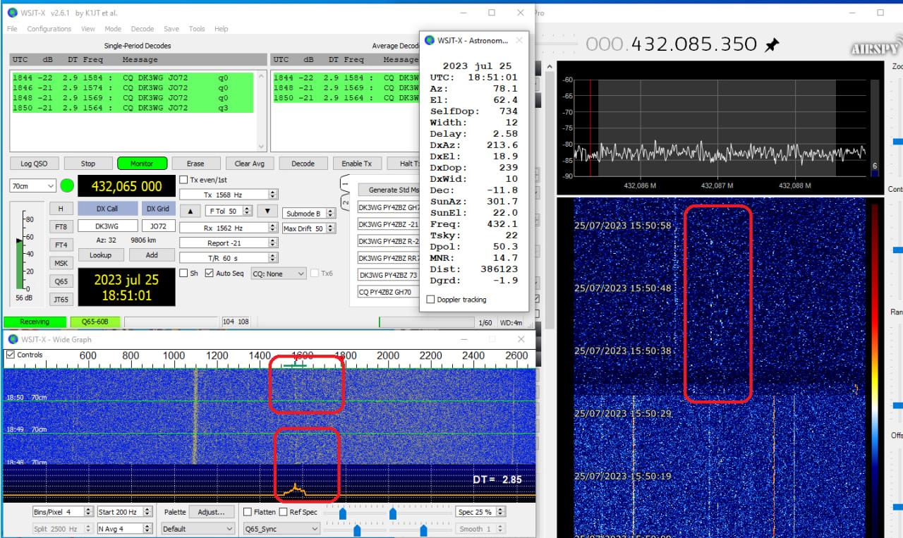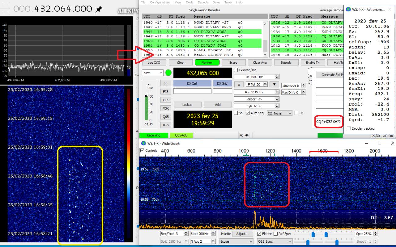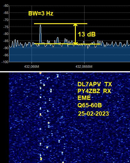 Em 25-02 -2023 consegui receber o sinal EME de DL7APV em 432 MHz no modo Q65-60B, cuja transmissão é feita com 750W num conjunto de 128 antenas Yagi de 11 elementos cada, com o um ganho total de 37 dBi ! O que corresponde a uma potencia isotrópica equivalente irradiada EIRP de 93,7 dBm ou quase 2,5 MW !