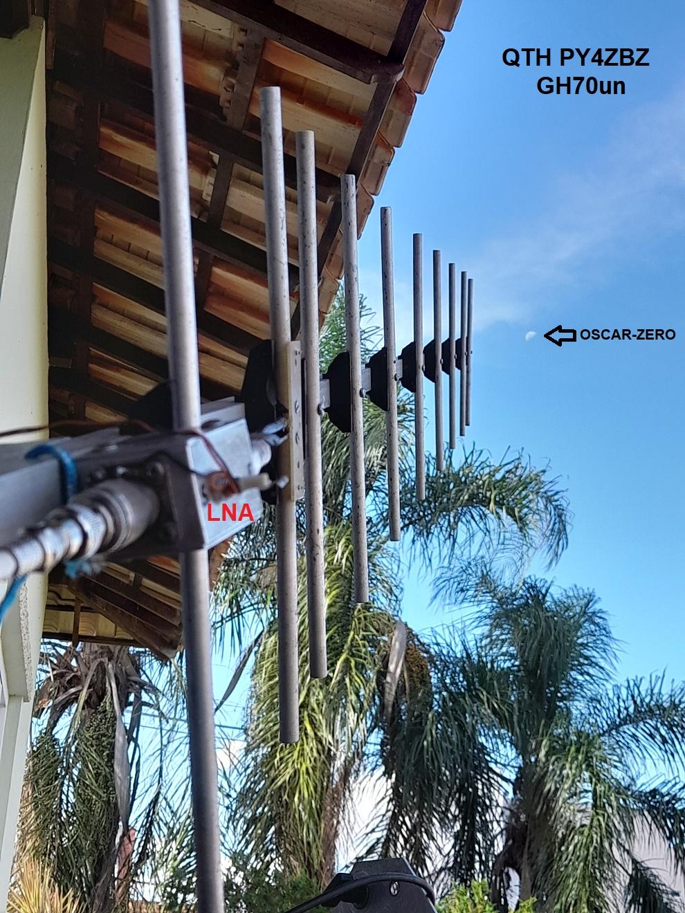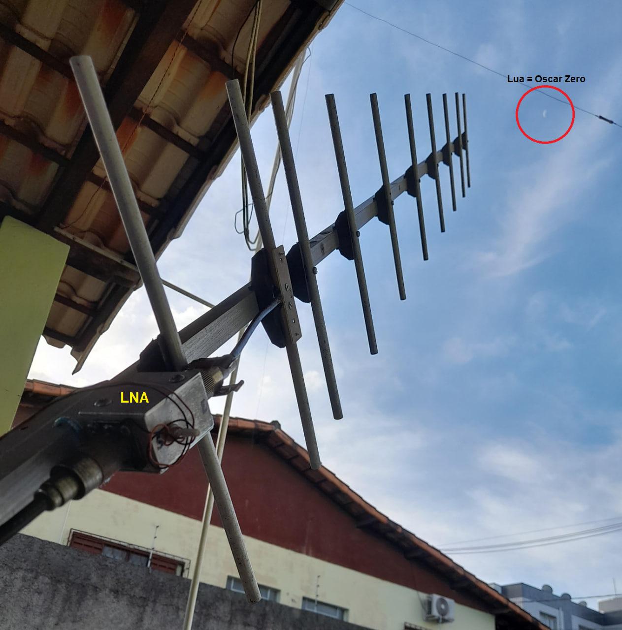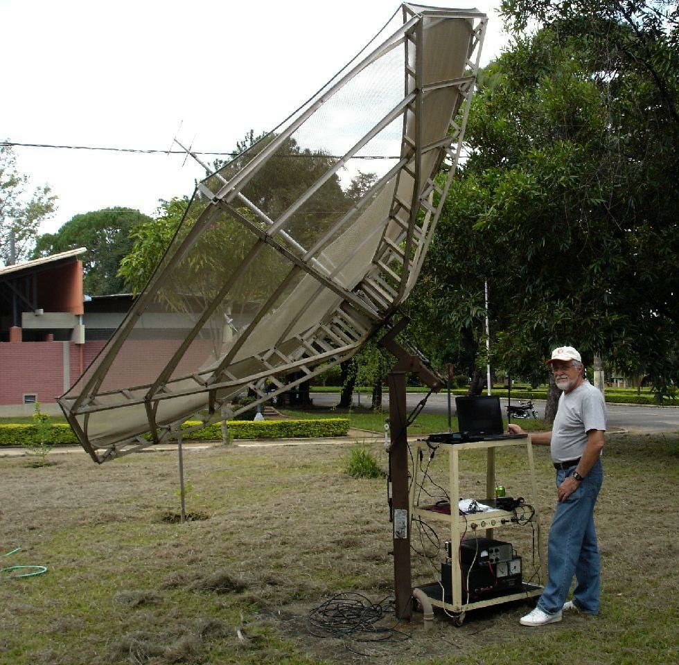 A foto seguinte mostra PY4ZBZ com a instalação de teste ! Ficou meio grande (uma Yagi de 16 elementos daria quase o mesmo resultado), mas funcionou e valeu pela experiência ! :