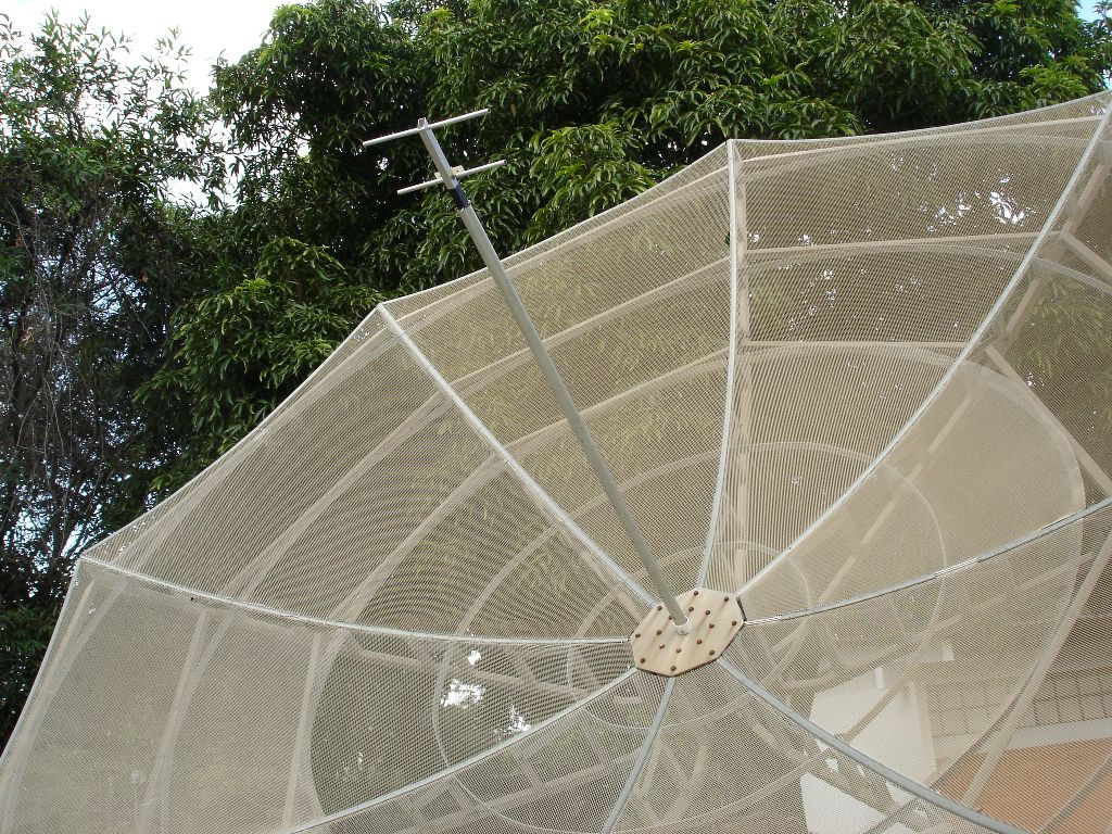 Resolvi fazer um teste usando uma velha antena para TVRO com refletor parabólico, substituindo o LNB da banda C por uma Yagi UHF de 2 elementos de construção caseira, com o radiador posicionado no foco, como pode ser visto na foto seguinte: