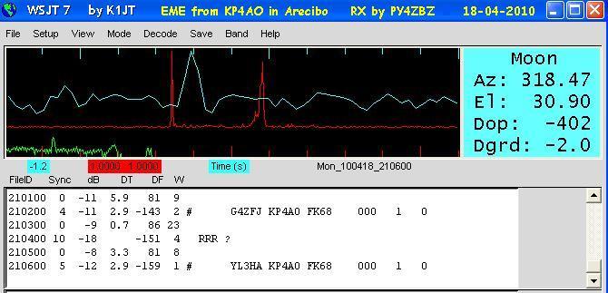 Não é qualquer simples mortal como eu, com uma yagi UHF de 6 elementos e um FT100D, que consegue captar um sinal por reflexão lunar ! A não ser que a transmissão seja feita usando a antena de 305 metros de diâmetro do radiotelescópio de Arecibo, Puerto Rico, em FK68oi, com 60 dBi de ganho em UHF e 400W !, como foi o caso, muito raro por sinal. Vejam o espectrograma seguinte, captado em 432,045 MHz as 21:30 UTC de 22-03-2010, em Sete Lagoas (GH70un), onde é fácil ver o prefixo da estação transmissora, em CW, KP4AO. Esta é a minha primeira recepção de um sinal EME (Earth-Moon-Earth, ou moon bounce). Ouçam aqui o áudio do sinal CW.