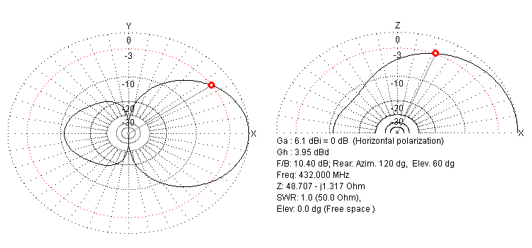 Em UHF, freqüência f=432 MHz, o ganho teórico, baseado em 18,2+20logD(m)f (GHz) é de 21,5 dBi, isso se toda a superfície do refletor for iluminada pelo alimentador. Acontece que a Yagi de 2 elementos usada para tal tem meios ângulos de 34 e 68 graus nos planos E e H respectivamente, como mostra a figura seguinte, feita com o MMANA:
