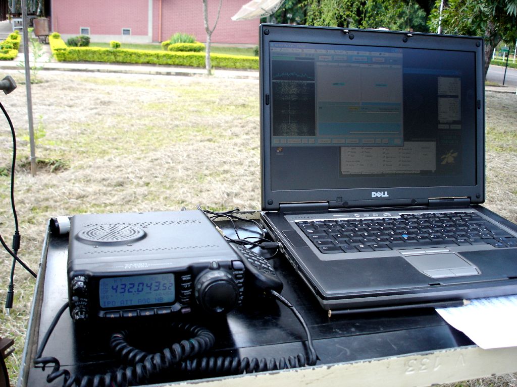 Portanto, somente aproximadamente a metade da superfície é corretamente iluminada. Devido a outras imperfeições, é de se esperar um ganho da ordem de 18 dBi. Conseguimos receber os sinais de CW, que inclusive podem ser vistos no meio do espectrograma na figura seguinte, onde aparece também o receptor usado, um FT100D sem preamplificador . E ATENÇÃO: fiquei sabendo apenas alguns dias depois, que por causa de um defeito no amplificador linear de KP4AO, a potencia transmitida era de apenas 30 W (no dia 16), e não 400 W como esperado !!!. Portanto, a antena ficou até bastante boa !: