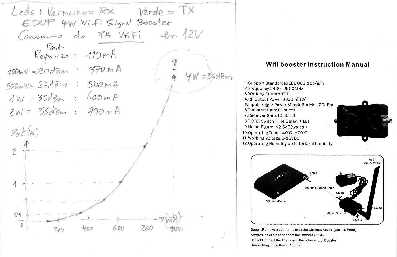 Como PA usamos um amplificador WiFi da china vendido como fornecendo 4W e com 13 dB de ganho. É a caixinha preta que aparece na foto seguinte, montada em uma placa de alumínio servindo de dissipador de calor: